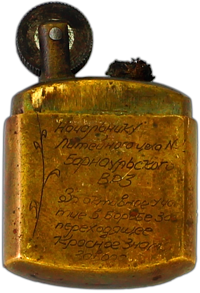 На зажигалке имеется дарственная надпись "От коллектива Краснознаменного Механического цеха № 1 г. Барнаул, май, 1942. Петру Егоровичу Кардаш, начальнику литейного цеха № 1 Барнаульского ВРЗ за активное участие в борьбе за переходящее Красное Знамя Завода".